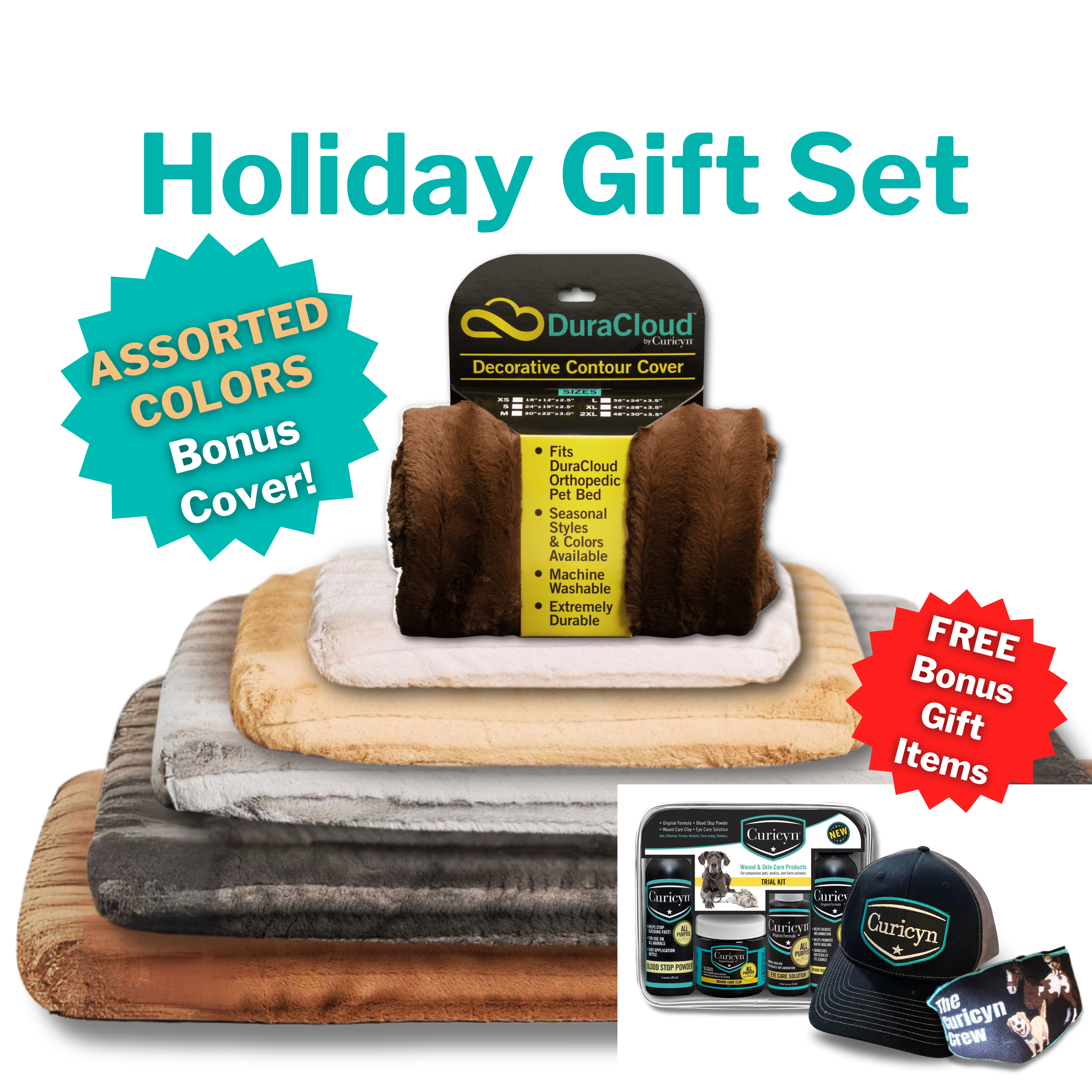 The perfect gift for the pet or pet lover in your life! Give the gift of a cloud with a DuraCloud gift set this holiday season. In addition to your choice of size and color DuraCloud beds, you also receive a Curicyn Trial Kit, a Curicyn logo hat, an extra cover (assorted colors), and even a Curicyn Crew toy for your pet! The trial kit includes trial travel-ready sizes of Original Wound Care Formula, Wound Care Clay, Eye Care Solution, and Blood Stop Powder. Curicyn’s DuraCloud bed offers superior orthopedic support for pets of all ages and sizes, allowing them to rest and relax as they need and deserve. Our hypoallergenic, machine-washable, skid-resistant, zipper-free bed is ideal for senior dogs with sore joints, new mothers who are nursing puppies, pets recuperating from surgery, and more. And it’s designed to last for the rest of your pet’s life – a truly durable cloud! All for 15% off the price of the bed alone. Give a gift of Curicyn & DuraCloud this holiday season.